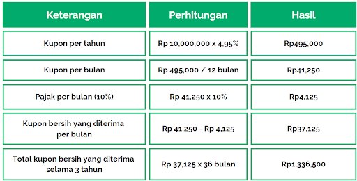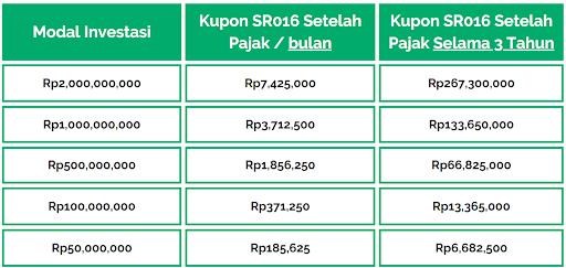 Kamu membeli SR016 sebesar Rp10 juta. Maka dengan perhitungan tabel di bawah, kamu akan mendapatkan imbal hasil setiap bulan sebesar Rp37.125. Jika diakumulasikan hingga jatuh tempo, maka kamu akan memperoleh sekitar Rp1,3 juta. Bagaimana dengan nominal lain? Tentunya semakin tinggi jumlah uang yang kamu investasikan di SR016, maka akan semakin besar juga hasil kupon yang akan didapatkan. Cek tabel berikut ini! Dari perhitungan tersebut, SR016 bisa memberikan kamu passive income dari kupon atau imbal hasil tiap bulannya. Di sisi lain, SR016 juga bisa cocok untuk tujuan investasi jangka menengah dalam 3 tahun ke depan. Apalagi jika kamu ingin menyimpan uang untuk tujuan investasi tertentu, misalnya bayar DP rumah atau dana pendidikan anak.