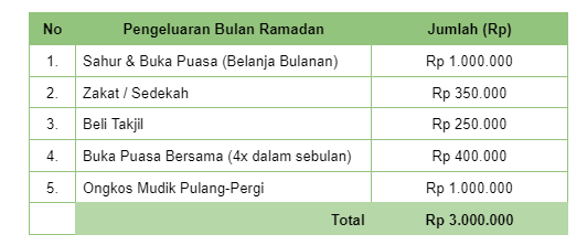 Berikut ini adalah contoh anggaran sesuai dengan kebutuhan yang biasanya dialokasikan untuk Bulan Ramadan: Kamu bisa membuat daftar pengeluaran dan anggarannya sedetail mungkin dan disesuaikan dengan kebutuhan & budget masing-masing. Lalu buatlah skala prioritasnya, kebutuhan mana yang paling penting untuk dipenuhi. Kalau sudah dibuat semua, jangan lupa untuk disiplin mengikuti budgeting yang sudah kamu tentukan, ya! ๐