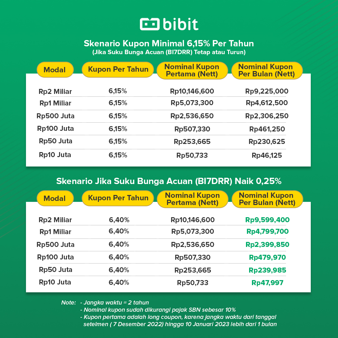 Cocok di tengah kenaikan suku bunga acuan saat ini karena imbal hasil ST009 bisa naik mengikuti suku bunga acuan BI. Tapi, jika suku bunga BI turun, batas minimal kupon yang Anda miliki tidak akan di bawah 6,15% per tahun.
