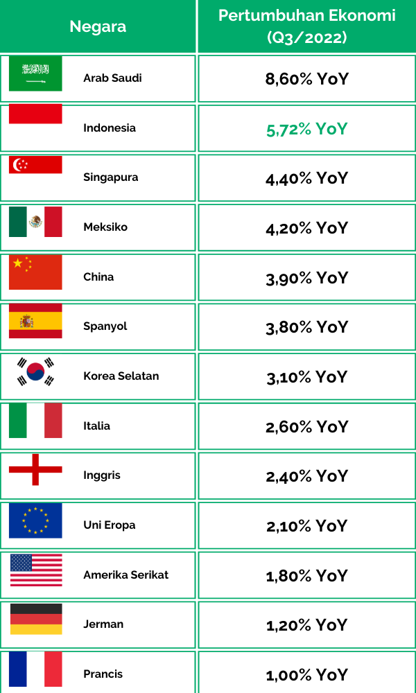 Lihat saja, Amerika Serikat (AS) sebagai negara dengan ekonomi terbesar di dunia hanya tumbuh 1,8% YoY pada kuartal III 2022. Begitu juga dengan China hanya tumbuh 3,9% YoY per kuartal III 2022.