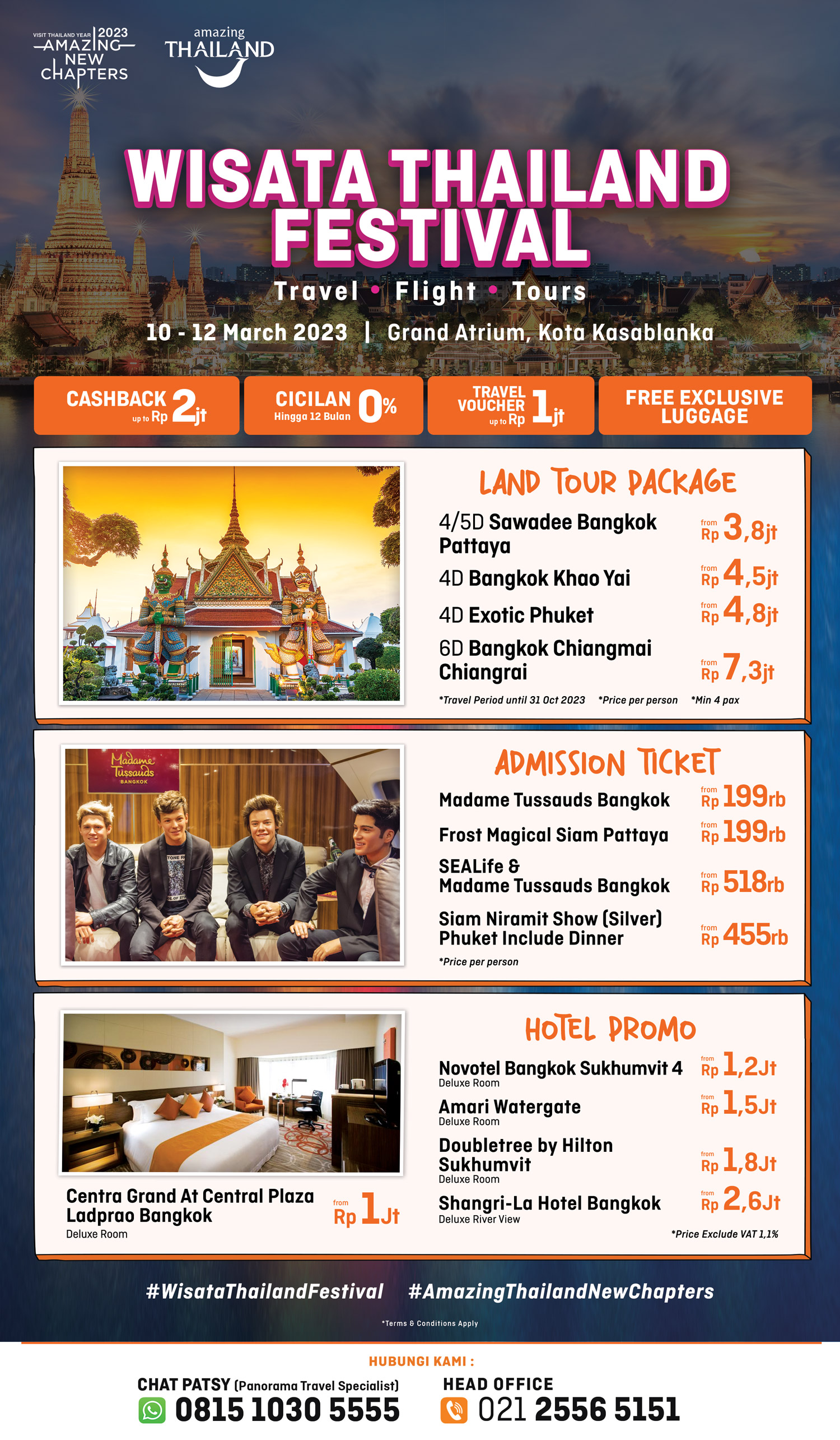 Sudah saatnya untuk mengambil waktu rehat dan menjelajahi keindahan Thailand! Tidak perlu bingung, karena Wisata Thailand Festival akan membawa Anda ke destinasi impian dengan harga terbaik. Nikmati promo tiket, hotel, tour, ticket admission, cruise, dan produk liburan lainnya selama acara 10-12 Maret 2023 di Wisata Thailand Travel, Kota Kasablanka. Dapatkan CASHBACK hingga Rp 2 Juta dengan CICILAN 0% hingga 6 bulan dari Panorama JTB untuk liburan spesial Anda. Jadi, tunggu apa lagi? Segera pesan dan raih pengalaman liburan tak terlupakan di Thailand dan hubungi 021-25565151 dan Chat Patsy di 081510305555. |