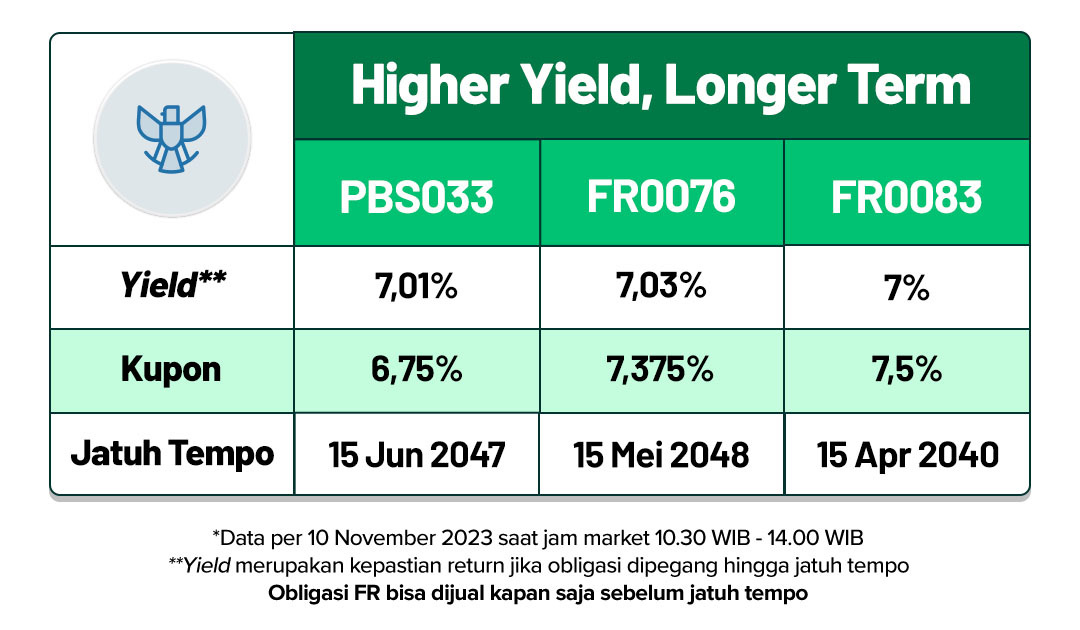 Peluang dari suku bunga yang tinggi saat ini akan membuat obligasi pemerintah Indonesia dengan tenor panjang menjadi lebih menarik, mengingat tingkat imbal hasil (yield) saat ini berada di kisaran ~7%. |