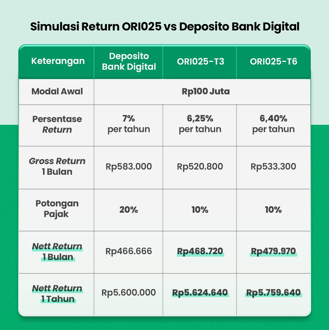 - ORI025-T3: tenor 3 tahun dengan imbal hasil 6,25% per tahun