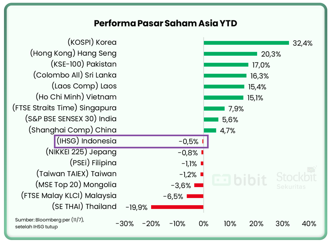 - Di Asia, indeks KOSPI Korea Selatan turut mencetak all-time high pada Jumat (11/7), dengan kenaikan +32,4% YTD, menjadikannya indeks dengan kinerja terbaik di Asia sejak awal 2025.