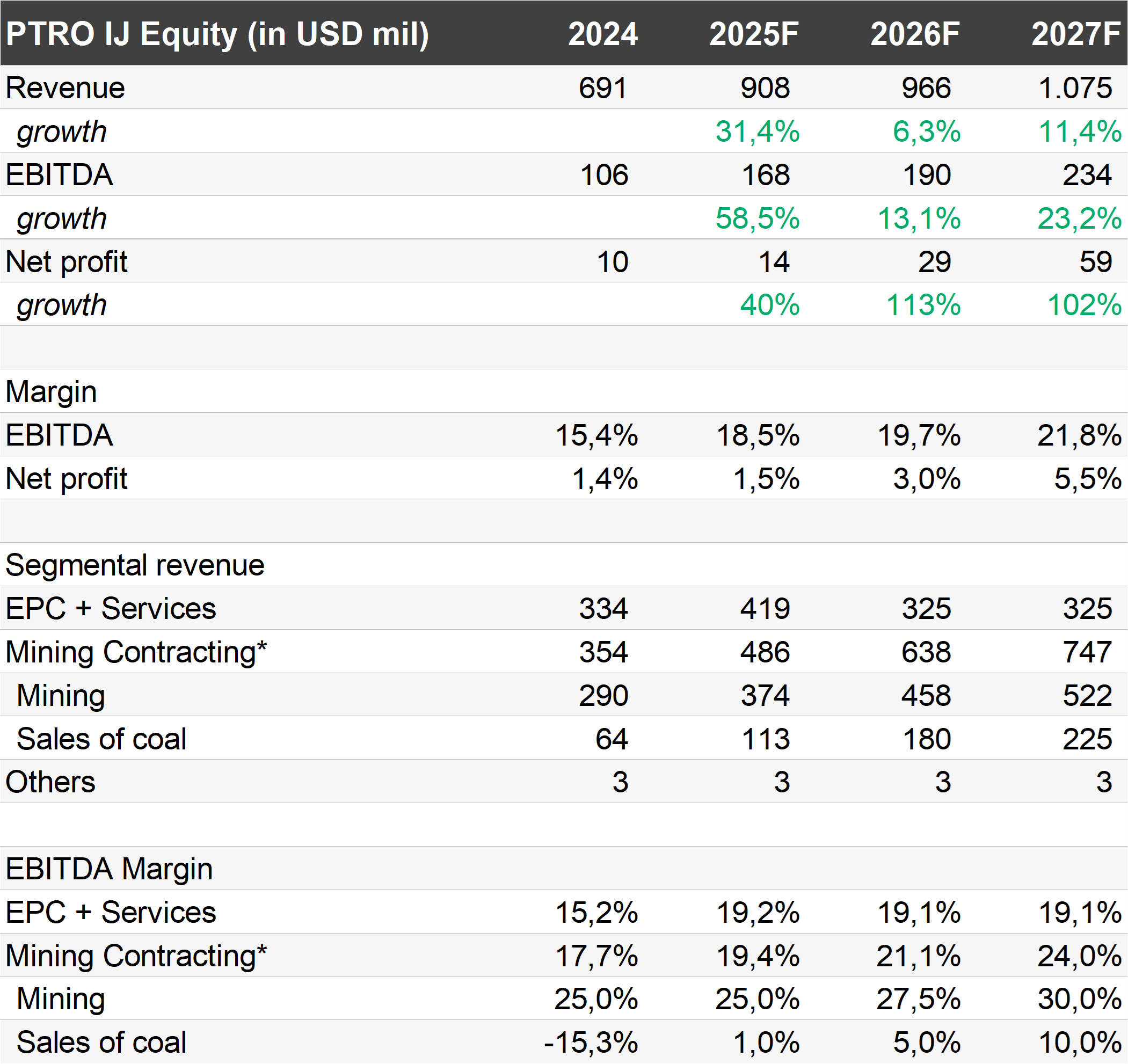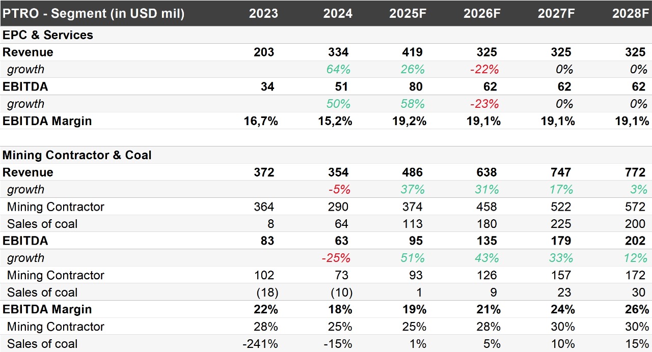 Peningkatan kinerja mulai terefleksi — Kami menilai PTRO akan menikmati pertumbuhan signifikan dalam beberapa tahun mendatang, yang berasal dari realisasi backlog kontrak yang telah diraih perseroan. Kami memperkirakan EBITDA perseroan akan tumbuh dari level US$106 juta pada 2024 menjadi US$257 juta pada 2028F (CAGR +25%). Sementara itu, laba bersih PTRO kami proyeksikan akan mencapai US$74 juta pada 2028F (CAGR +66%), naik dari level US$10 juta pada 2024. Pertumbuhan ini akan didorong oleh: 1) realisasi bisnis EPC dalam waktu dekat; dan 2) peningkatan kontribusi bisnis kontraktor dari proyek–proyek tambang baru yang dikerjakan PTRO.