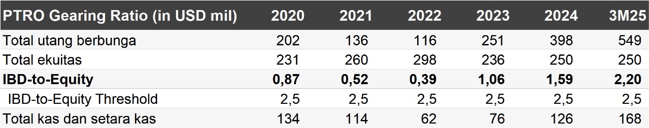 Setelah menerbitkan obligasi senilai total Rp2 T dan sukuk senilai total Rp1 T pada Desember 2024 dan Maret 2025, rasio utang berbunga terhadap ekuitas (net debt to equity) PTRO terus meningkat menjadi 2,2x pada 1Q25, mendekati batas yang ditetapkan perbankan di level 2,5x. Rasio utang bersih terhadap ekuitas yang sudah tinggi tersebut memberikan ruang terbatas bagi PTRO untuk melakukan akuisisi jumbo ke depannya.
