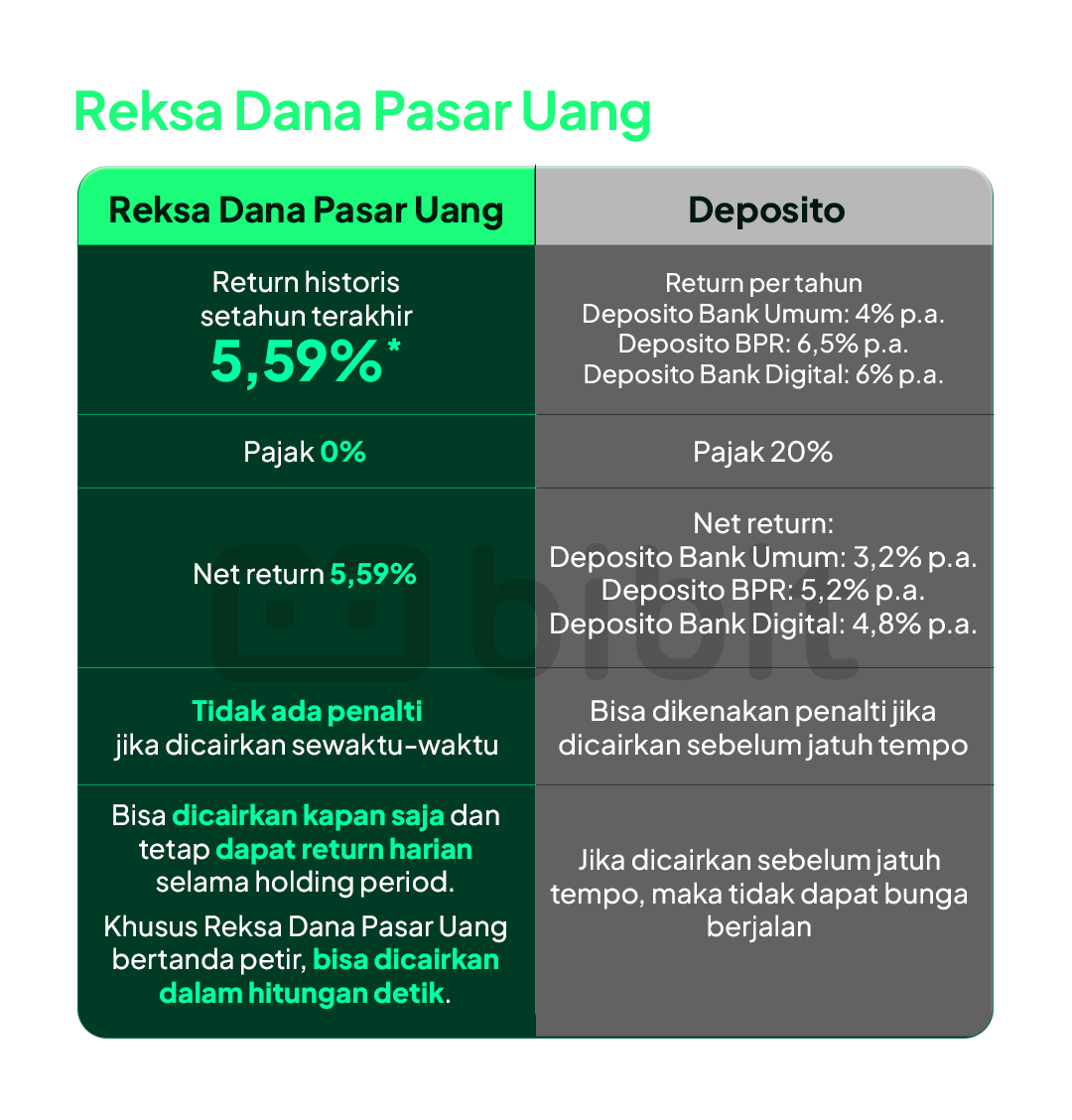Perbedaan Deposito vs Reksa Dana Pasar Uang. Return berjalan harian kapanpun holding period-mu dan bisa cair kapan saja 👉