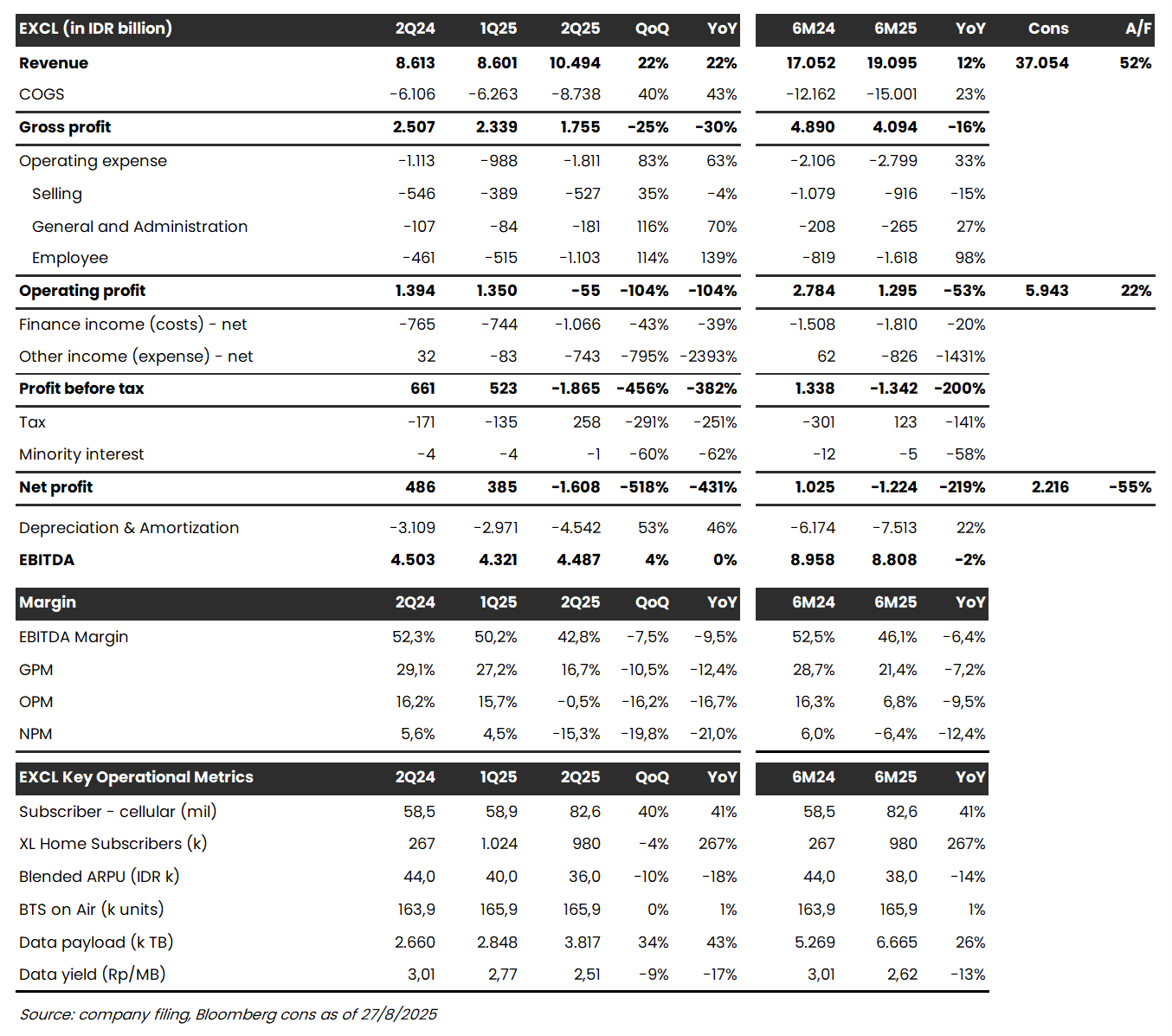 XLSmart Telecom Sejahtera ($EXCL) mencatatkan rugi bersih sebesar 1,6 triliun rupiah pada 2Q25 (vs. 1Q25: laba 385 miliar rupiah, 2Q24: laba 484 miliar rupiah). Hasil ini membuat rugi bersih EXCL selama 1H25 menjadi 1,2 triliun rupiah (vs. 1H24: laba 1 triliun rupiah), di bawah ekspektasi 2025F konsensus yang memperkirakan laba bersih 1,5 triliun rupiah. Berikut beberapa catatan penting kami:
