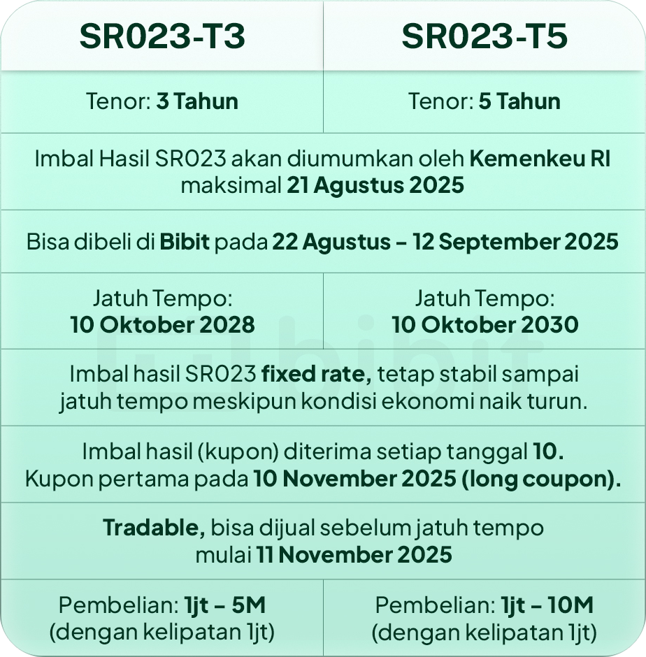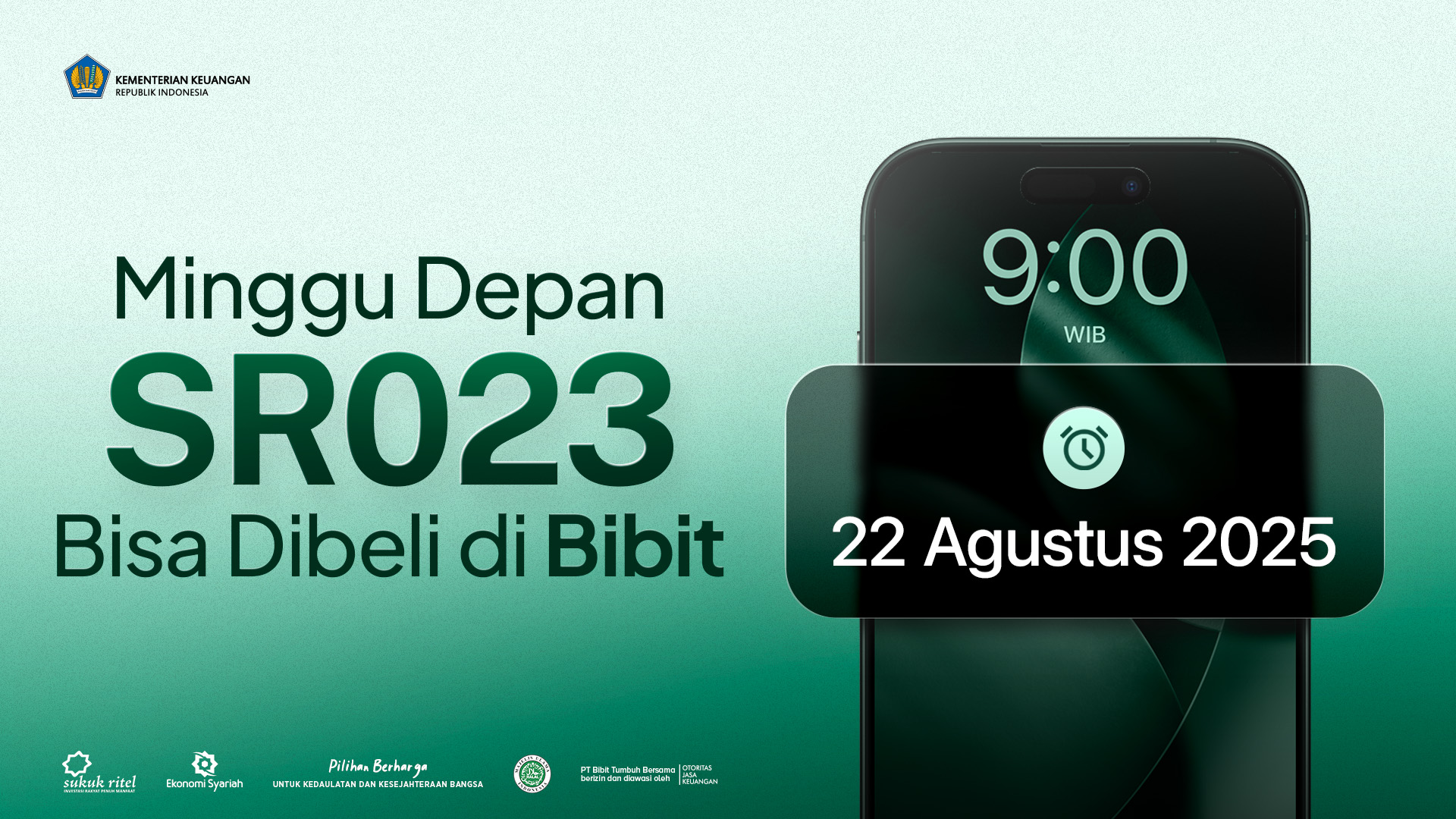 SBN Syariah terbaru seri Sukuk Ritel SR023 akan segera terbit minggu depan dan bisa dibeli di Bibit mulai Jumat, 22 Agustus 2025 pukul 09.00 WIB hingga 12 September 2025. |