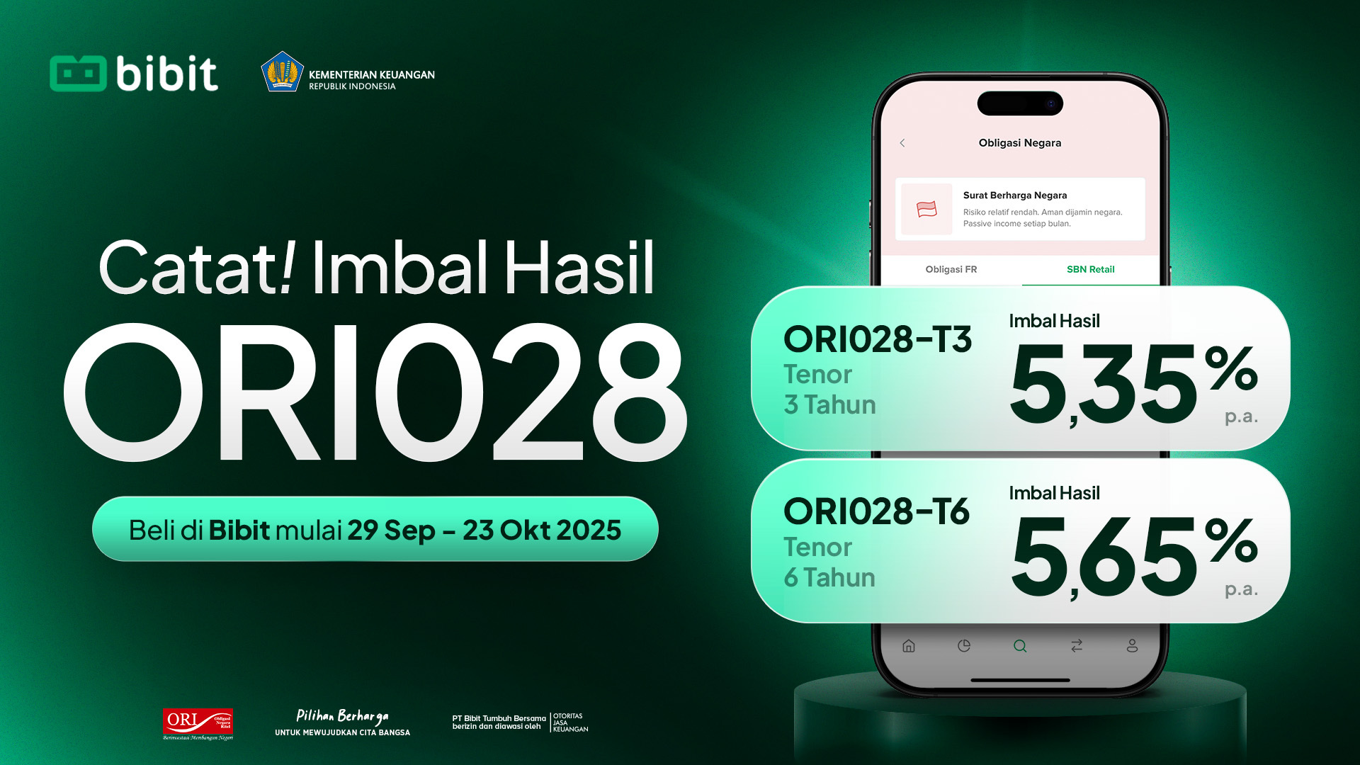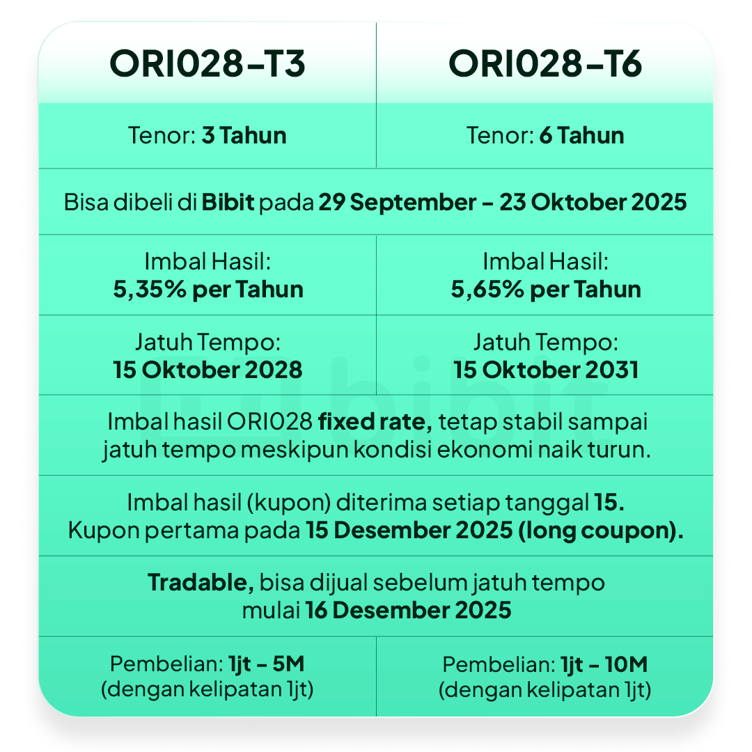 Pemerintah tetapkan return Obligasi Negara Ritel seri ORI028 hingga 5,65% per tahun. SBN ORI028 bisa kamu beli di Bibit pada masa penawaran yang berlangsung mulai dari Senin, 29 September 2025 pukul 09.00 WIB sampai 23 Oktober 2025 pukul 10.00 WIB. |
