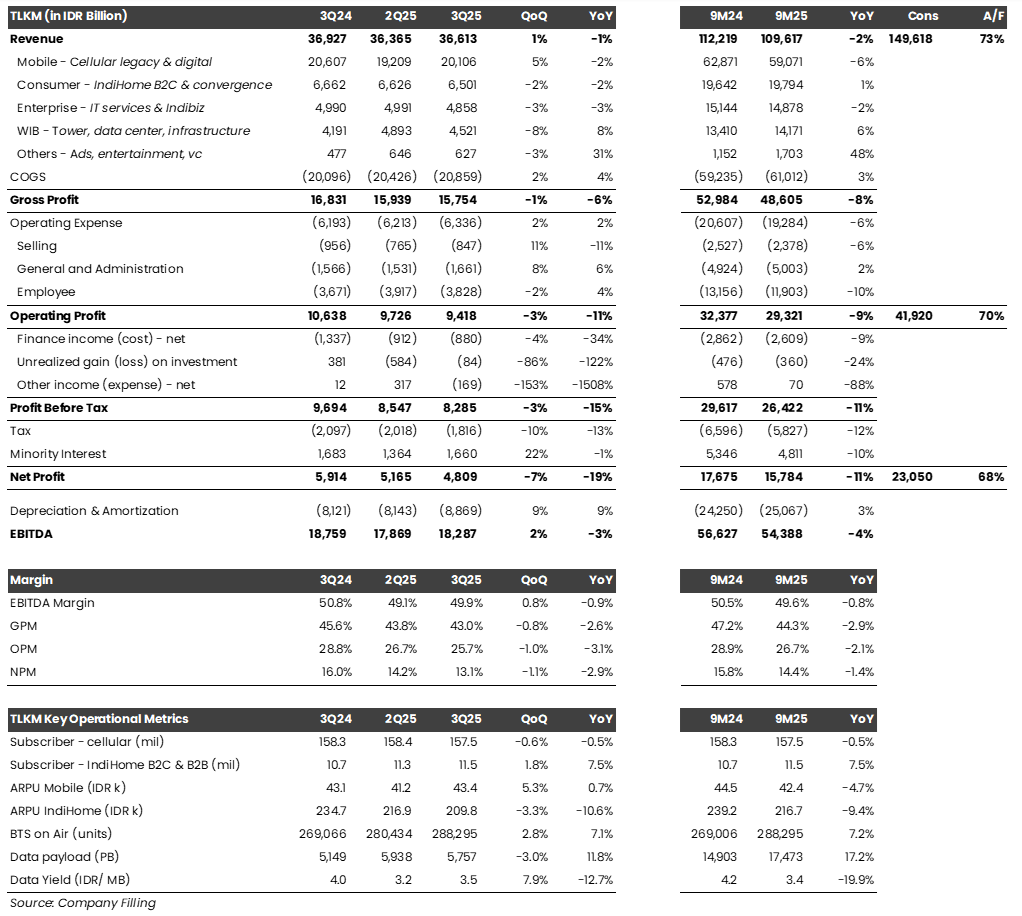 Kinerja pendapatan dari segmen bisnis lain juga tertekan pada 3Q25 — yakni, segmen 'enterprise' (-3% YoY, -3% QoQ) dan 'wholesales and international business' (+8% YoY, -8% QoQ) — sehingga turut membuat pendapatan TLKM pada 3Q25 relatif flat (-1% YoY, +1% QoQ).
