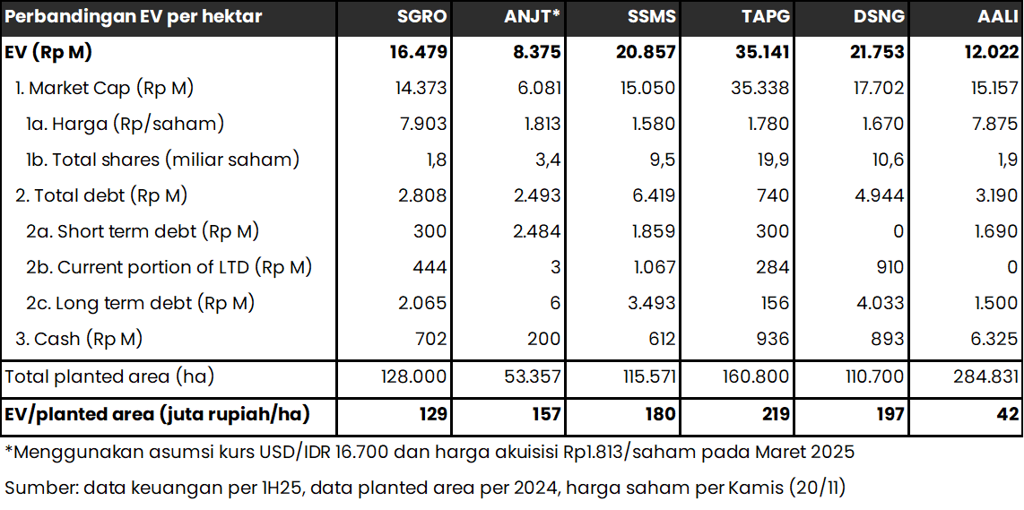 Secara valuasi EV/hektare, transaksi SGRO dilakukan pada level ~129 juta rupiah per hektare, lebih murah dibandingkan transaksi akuisisi $ANJT oleh First Resources Ltd. pada Maret 2025 (~157 juta rupiah per hektare) maupun dengan peers–nya seperti $SSMS (~181 juta rupiah per hektare), $TAPG (~212 juta rupiah per hektare), dan $DSNG (~195 juta rupiah per hektare). Namun, valuasi transaksi SGRO berada di atas $AALI yang tercatat ~42 juta rupiah per hektare. Perbedaan nilai valuasi EV/hektare perusahaan CPO sendiri dapat dipengaruhi oleh berbagai faktor seperti, persepsi pasar terhadap produktivitas tanaman, outlook pertumbuhan, serta profitabilitas aset perkebunan maupun non–perkebunan yang dimiliki perusahaan.