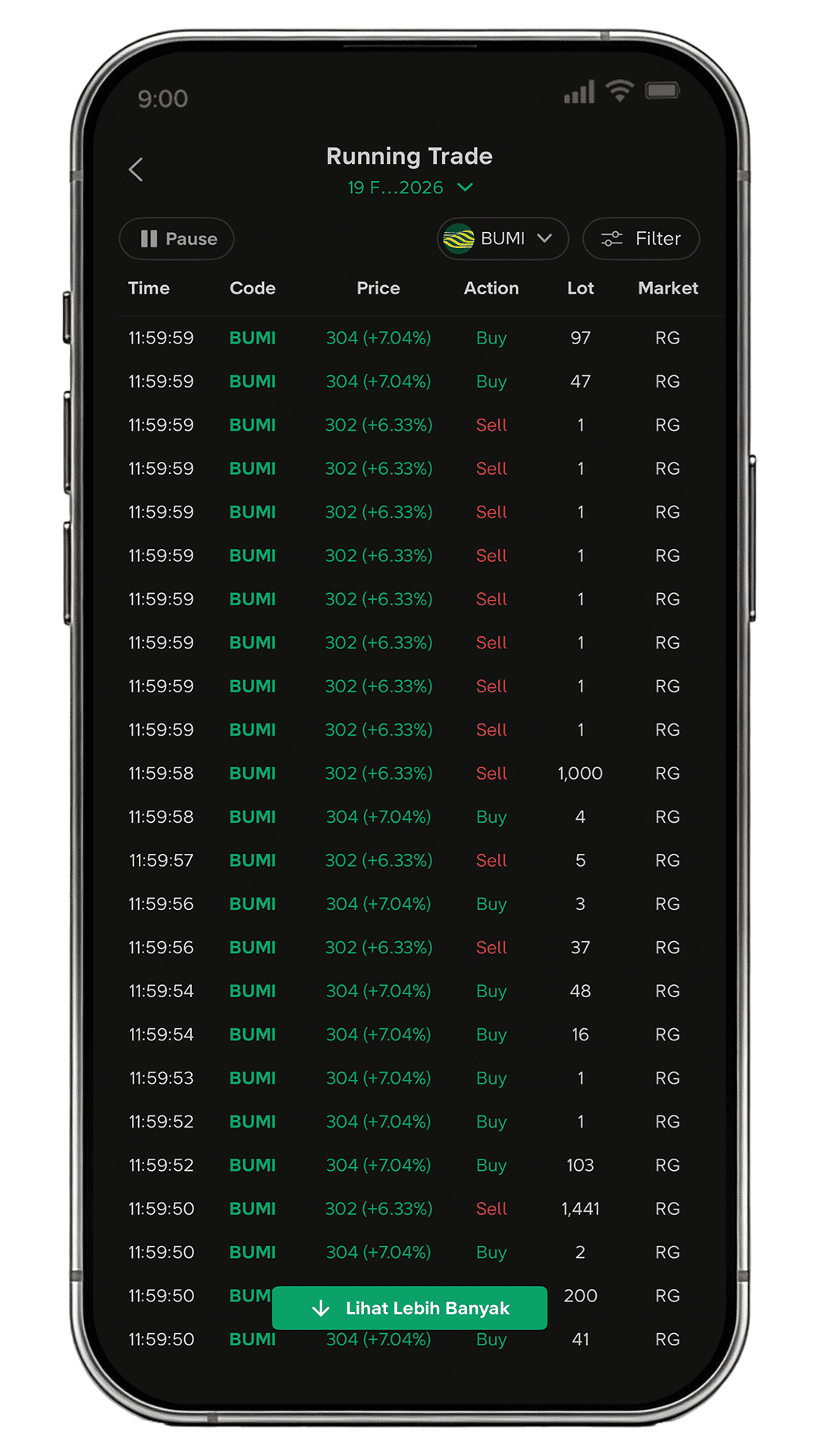 | Running Trade Melihat data transaksi paling detail yang menampilkan setiap transaksi yang terjadi di pasar. - Menyajikan informasi lengkap seperti waktu transaksi, jumlah lot, harga, action (buy/sell), serta broker buyer dan seller.